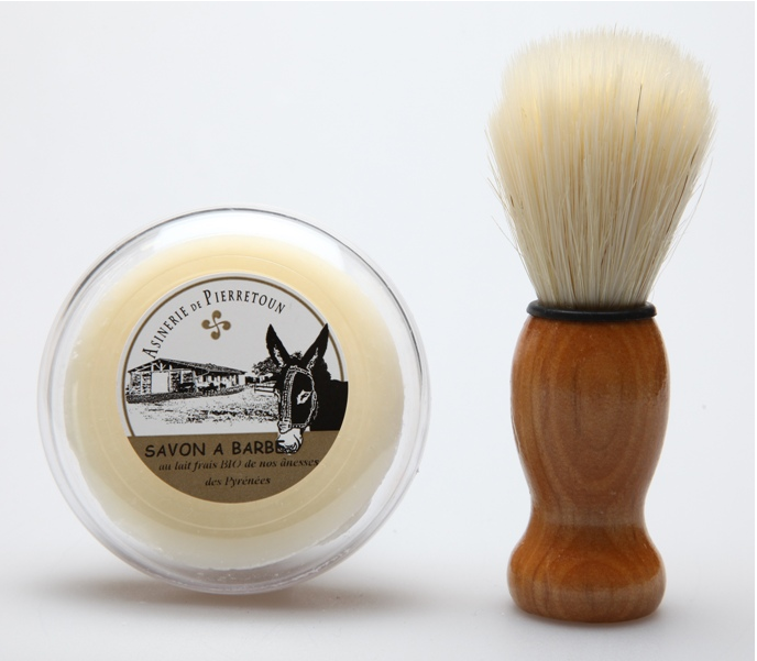 Le savon à barbe avec 10 % de lait d'anesse frais & bio des Pyrénées et 5 % de beurre e karité pour un rasage douceur.